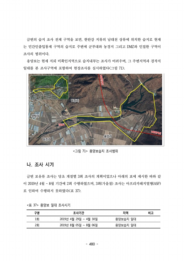 480 금번의 습지 조사 전체 구역을 보면 한탄강 지류의 남대천 상류에 위치한 습지로 현재 , 는 민간인출입통제 구역의 습지로 주변에 군부대와 농경지 그리고 와 인접한 구역이 DMZ 조사의 범위이다. 용양보는 현재 지뢰 미확인지역으로 습지내부는 조사가 어려우며 그 주변지역과 경작지 , 일대를 본 조사구역에 포함하여 현장조사를 실시하였다 그림 71 그림 71 용양보습지 조사범위 금번 포유류 조사는 당초 계절별 회 조사의 계획이었으나 아래의 표에 제시한 바와 같 3 이 년 월 월 기간에 회 수행하였으며 회 가을철 조사는 아프리카돼지열병 2019 4 8 2 , 3 ASF 로 인하여 수행하지 못하였다 표 37 구분 조사기간 지역 비고 회1 2019 4 29 4 30 년 월 일 월 일 용양보습지 일대 회2 2019 ...
