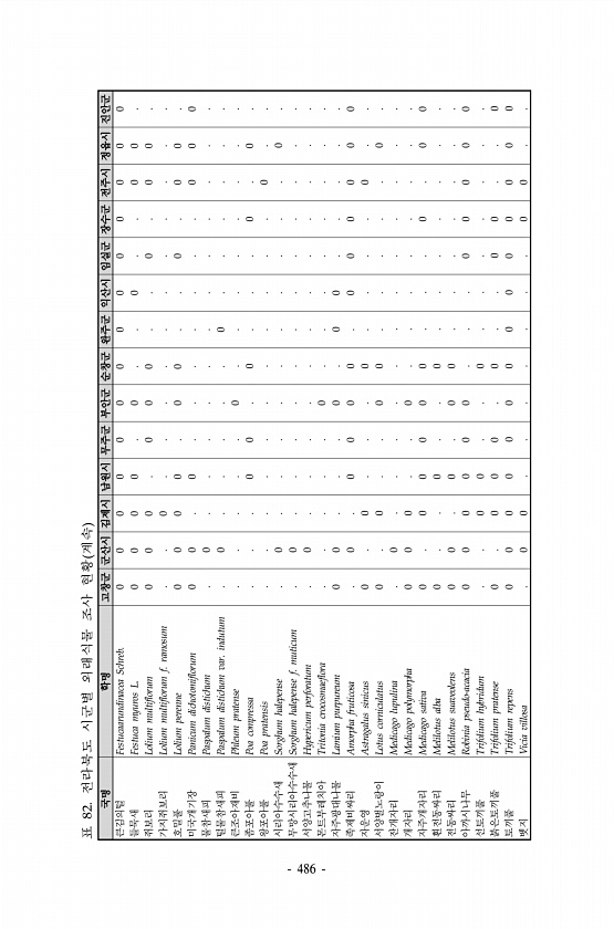 표 82. 전라북도 시군별 외래식물 조사 현황 계속 국명 학명 고창군 군산시 김제시 남원시 무주군 부안군 순창군 완주군 익산시 임실군 장수군 전주시 정읍시 진안군 큰김의털 Festucaarundinacea Schreb. 0 0 0 0 0 0 0 0 0 0 0 0 0 0 들묵새 Festuca myuros L. 0 0 0 0 0 0 0 0 쥐보리 Lolium multiflorum 0 0 0 0 0 0 0 0 0 가지쥐보리 Lolium multiflorum f. ramosum 0 호밀풀 Lolium perenne 0 0 0 0 0 0 0 0 0 미국개기장 Panicum dichotomiflorum 0 0 0 0 0 0 물참새피 Paspalum distichum 0 털물참새피 Paspalum distichum va...
