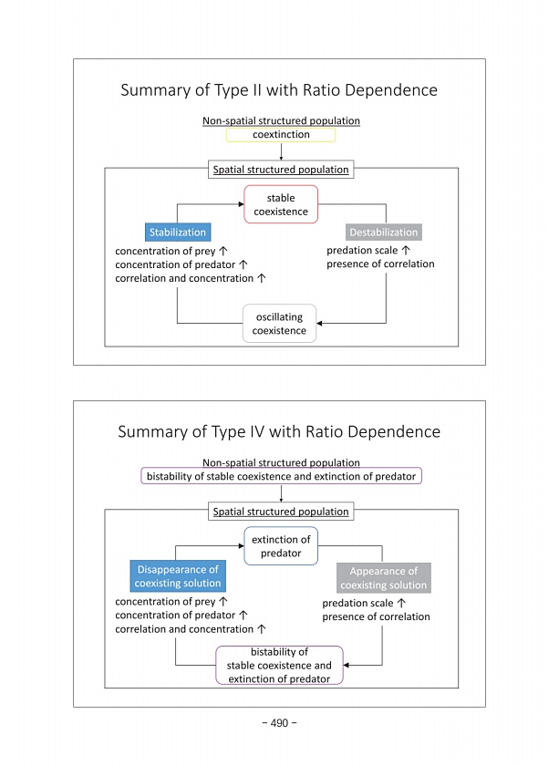 Summary of Type IV with Ratio Dependence Non-spatial structured population bistability of stable coexistence and extinction of predator Spatial structured population bistability of stable coexistence and extinction of predator extinction of predator predation scale ↑ presence of correlation concentration of prey ↑ concentration of predator ↑ correlation and concentration ↑ Disappearance of coexist...