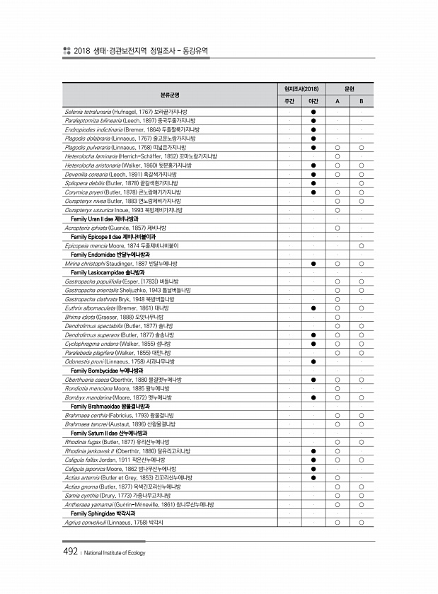 2018 생태·경관보전지역 정밀조사 동강유역 492 ? National Institute of Ecology 분류군명 현지조사 2018 문헌 주간 야간 A B Selenia tetralunaria Hufnagel, 1767 보라끝가지나방 ● Paraleptomiza bilinearia Leech, 1897 중국두줄가지나방 ● Endropiodes indictinaria Bremer, 1864 두줄짤룩가지나방 ● Plagodis dolabraria Linnaeus, 1767 줄고운노랑가지나방 ● Plagodis pulveraria Linnaeus, 1758 띠넓은가지나방 ● ○ ○ Heterolocha laminaria Herrich-Sch?ffer, 1852 꼬...