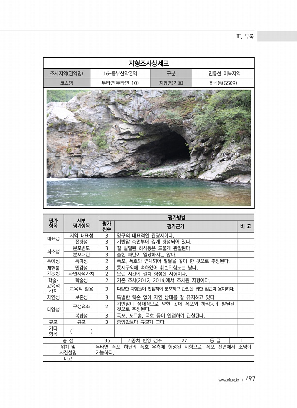 Ⅲ. 부록 www.nie.re.kr ? 497 지형조사상세표 조사지역 권역명 16-동부산악권역 구분 민통선 이북지역 코스명 두타연 두타연-10 지형명 기호 하식동 GS09 평가 항목 세부 평가항목 평가방법 평가 점수 평가근거 비 고 대표성 지역 대표성 3 양구의 대표적인 관광지이다. 전형성 3 기반암 측면부에 깊게 형성되어 있다. 희소성 분포빈도 3 잘 발달된 하식동은 드물게 관찰된다. 분포패턴 3 출현 패턴이 일정하지는 않다. 특이성 특이성 2 폭포, 폭호와 연계되어 발달을 같이 한 것으로 추정된다. 재현불 가능성 민감성 3 통제구역에 속해있어 훼손위험도는 낮다. 자연사적가치 2 오랜 시간에 걸쳐 형성된 지형이다. 학술· 교육적 가치 학술성 2 기존 조사 2012, 2014 에서 조사된 지형이다. 교육적 ...