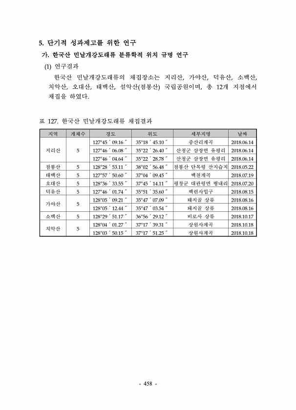 458 5. 단기적 성과제고를 위한 연구 가. 한국산 민날개강도래류 분류학적 위치 규명 연구 1 연구결과 한국산 민날개강도래류의 채집장소는 지리산, 가야산, 덕유산, 소백산, 치악산, 오대산, 태백산, 설악산 점봉산 국립공원이며, 총 12개 지점에서 채집을 하였다. 지역 개체수 경도 위도 세부지명 날짜 지리산 5 127°45′09.16″ 35°18′45.10″ 중산리계곡 2018.06.14 127°46′06.08″ 35°22′26.40″ 산청군 삼장면 유평리 2018.06.14 127°46′04.64″ 35°22′28.78″ 산청군 삼장면 유평리 2018.06.14 점봉산 5 128°28′53.11″ 38°02′56.48″ 점봉산 단목령 산지습지 2018.05.22 태백산 5 127°57′50.60″ 37°...