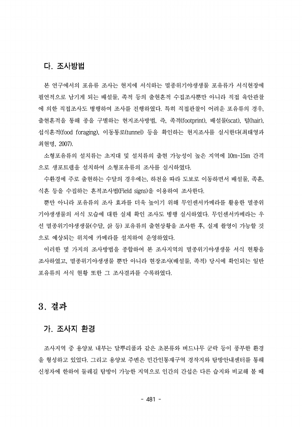 481 본 연구에서의 포유류 조사는 현지에 서식하는 멸종위기야생생물 포유류가 서식현장에 필연적으로 남기게 되는 배설물 족적 등의 출현흔적 수집조사뿐만 아니라 직접 육안관찰 , 에 의한 직접조사도 병행하여 조사를 진행하였다 특히 직접관찰이 어려운 포유류의 경우 , 출현흔적을 통해 종을 구별하는 현지조사방법 즉 족적 , , footprint , scat , hair , 배설물 털 섭식흔적 food foraging , tunnel 이동통로 등을 확인하는 현지조사를 실시한다 최태영과 최현명, 2007 소형포유류의 설치류는 초지대 및 설치류의 출현 가능성이 높은 지역에 간격 10m15m 으로 생포트랩을 설치하여 소형포유류의 조사를 실시하였다. 수환경에 주로 출현하는 수달의 경우에는 하천을 따라 도보로 이동하면서 배설...