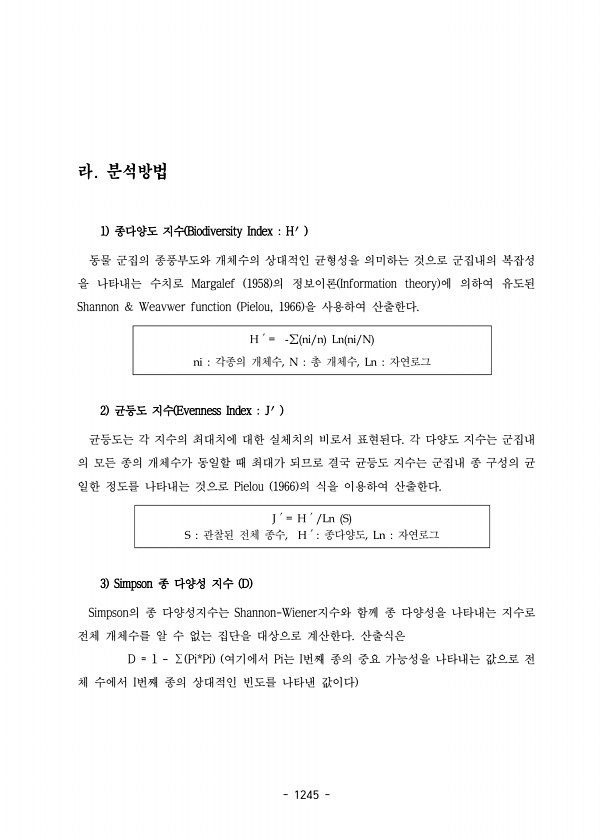 1245 라. 분석방법 1 종다양도 지수 Biodiversity Index H′ 동물 군집의 종풍부도와 개체수의 상대적인 균형성을 의미하는 것으로 군집내의 복잡성 을 나타내는 수치로 Margalef 1958 의 정보이론 Information theory 에 의하여 유도된 Shannon & Weavwer function Pielou, 1966 을 사용하여 산출한다. H′= -∑ ni/n Ln ni/N ni 각종의 개체수, N 총 개체수, Ln 자연로그 2 균등도 지수 Evenness Index J′ 균등도는 각 지수의 최대치에 대한 실체치의 비로서 표현된다. 각 다양도 지수는 군집내 의 모든 종의 개체수가 동일할 때 최대가 되므로 결국 균등도 지수는 군집내 종 구성의 균 일한 정도를 나타내는 것으로 Pielo...