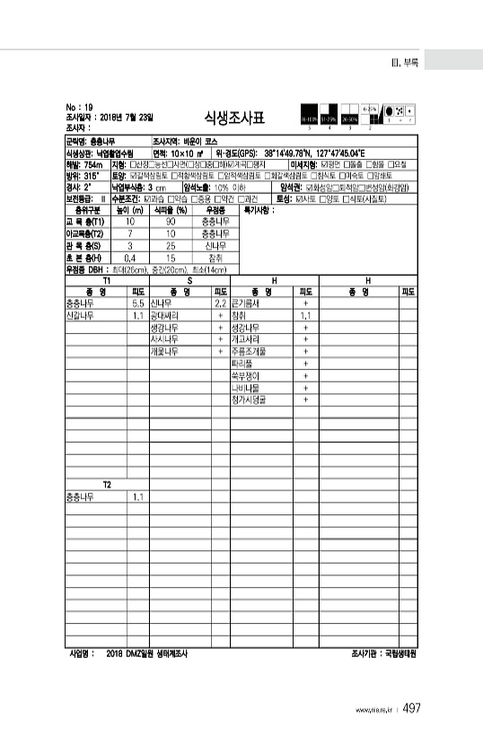 Ⅲ. 부록 www.nie.re.kr ? 497 No 19 조사일자 2018년 7월 23일 조사자 식생조사표 군락명층층나무 조사지역비운이 코스 식생상관낙엽활엽수림 면적10×10 ㎡ 위·경도 GPS 38°1449.78N, 127°4745.04E 해발754m 지형□산정□능선□사면 □상□중□하 ?계곡□평지 미세지형?평면 □돌출 □함몰 □요철 방위315° 토양?갈색삼림토 □적황색삼림토 □암적색삼림토 □회갈색삼림토 □침식토 □미숙토 □암쇄토 경사2° 낙엽부식층3 cm 암석노출10% 이하 암석권?화성암□퇴적암□변성암 화강암 보전등급Ⅱ 수분조건?과습 □약습 □중용 □약건 □과건 토성?사토 □양토 □식토 사질토 층위구분 높이 m 식피율 % 우점종 특기사항 교 목 층 T1 10 90 층층나무 아교목층 T2 7 10 층층나무 ...