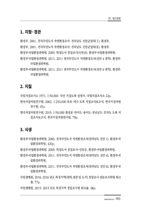 IV. 참고문헌 www.nie.re.kr ?491 1. · 환경부, 2001, 전국무인도서 자연환경조사전라남도 신안군일대 Ⅰ , 환경부. 환경부, 2001, 전국무인도서 자연환경조사전라남도 신안군일대 Ⅱ , 환경부. 환경부?국립환경과학원. 2009. 특정도서 정밀조사 신안군 환경부?국립환경과학원. 환경부?국립환경과학원. 2011. 2011 전국무인도서 자연환경조사 신안 4 권역 환경부? 국립환경과학원. 환경부?국립환경과학원. 2011. 2011 전국무인도서 자연환경조사 신안 6 권역 환경부? 국립환경과학원. 2. 국립지질조사소 1971. 150,000 무안 지질도폭 설명서. 국립지질조사소 22p. 한국지질자원연구원. 2002. 1250,000 목포·여수 도폭 지질조사보고서. 한국지질자원 연구원. 45p. 한...