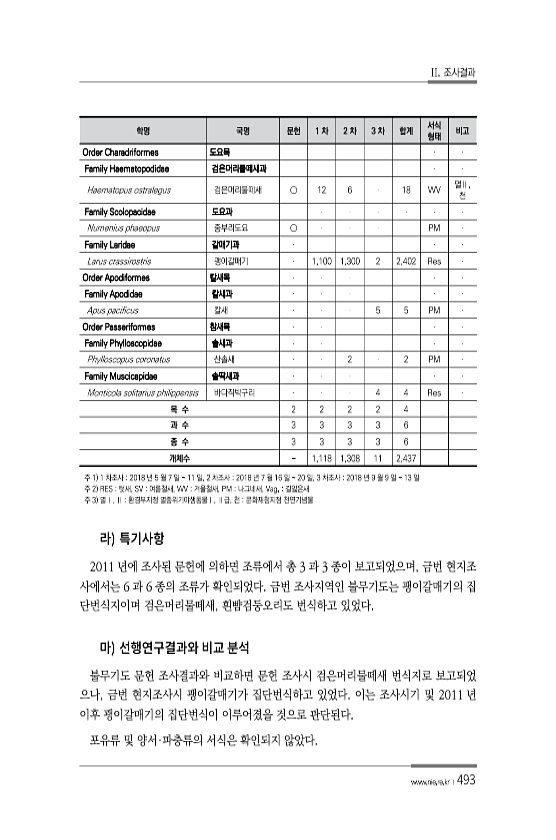 II. 조사결과 www.nie.re.kr ?493 2011 년에 조사된 문헌에 의하면 조류에서 총 3 과 3 종이 보고되었으며, 금번 현지조 사에서는 6 과 6 종의 조류가 확인되었다. 금번 조사지역인 불무기도는 괭이갈매기의 집 단번식지이며 검은머리물떼새, 흰뺨검둥오리도 번식하고 있었다. 불무기도 문헌 조사결과와 비교하면 문헌 조사시 검은머리물떼새 번식지로 보고되었 으나, 금번 현지조사시 괭이갈매기가 집단번식하고 있었다. 이는 조사시기 및 2011 년 이후 괭이갈매기의 집단번식이 이루어졌을 것으로 판단된다. 포유류 및 양서·파충류의 서식은 확인되지 않았다. 학명 국명 문헌 1 차 2 차 3 차 합계 서식 형태 비고 Order Charadriformes 도요목 Family Haematopodidae 검은머리물...