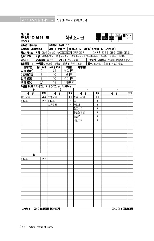 2018 DMZ 일원 생태계 조사 민통선이북지역 중부산악권역 498 ? National Institute of Ecology No 20 조사일자 2018년 5월 14일 조사자 식생조사표 군락명버드나무 조사지역비운이 코스 식생상관낙엽활엽수림 면적10×10 ㎡ 위·경도 GPS 38°1434.50N, 127°4625.04E 해발754m 지형□산정□능선□사면 □상□중□하 ?계곡□평지 미세지형?평면 □돌출 □함몰 □요철 방위315° 토양?갈색삼림토 □적황색삼림토 □암적색삼림토 □회갈색삼림토 □침식토 □미숙토 □암쇄토 경사2° 낙엽부식층3 cm 암석노출25% 이하 암석권?화성암□퇴적암□변성암 화강암 보전등급Ⅱ 수분조건?과습 □약습 □중용 □약건 □과건 토성?사토 □양토 □식토 사질토 층위구분 높이 m 식피율 % 우점종...