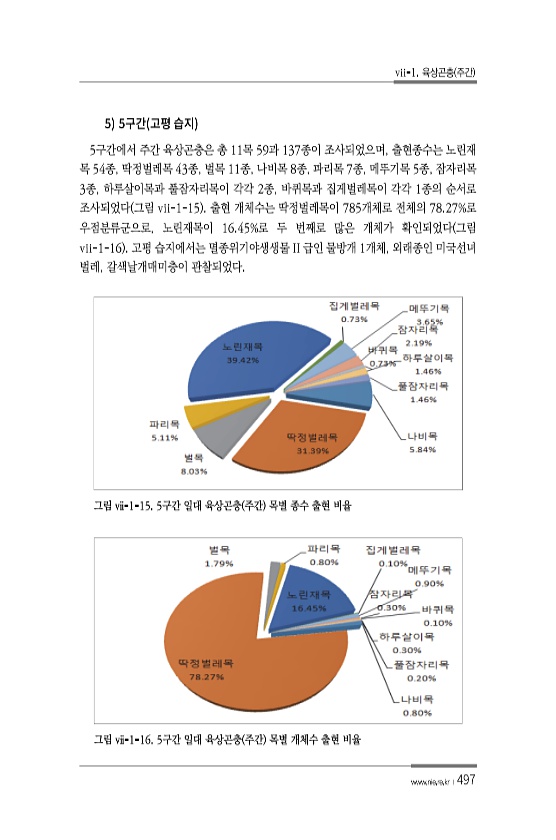 vii-1. 육상곤충 주간 www.nie.re.kr ?497 5 5 5구간에서 주간 육상곤충은 총 11목 59과 137종이 조사되었으며, 출현종수는 노린재 목 54종, 딱정벌레목 43종, 벌목 11종, 나비목 8종, 파리목 7종, 메뚜기목 5종, 잠자리목 3종, 하루살이목과 풀잠자리목이 각각 2종, 바퀴목과 집게벌레목이 각각 1종의 순서로 조사되었다 그림 vii-1-15 출현 개체수는 딱정벌레목이 785개체로 전체의 78.27%로 우점분류군으로, 노린재목이 16.45%로 두 번째로 많은 개체가 확인되었다 그림 vii-1-16 고평 습지에서는 멸종위기야생생물 II 급인 물방개 1개체, 외래종인 미국선녀 벌레, 갈색날개매미충이 관찰되었다. 그림 ⅶ-1-15. 5구간 일대 육상곤충 주간 목별 종수 출현 비율 그림...