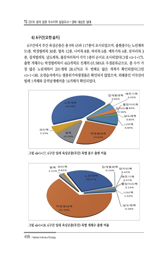 2018 생태·경관 우수지역 발굴조사 경북 내성천 일대 498 ? National Institute of Ecology 6 6 6구간에서 주간 육상곤충은 총 9목 45과 117종이 조사되었으며, 출현종수는 노린재목 51종, 딱정벌레목 30종, 벌목 12종, 나비목 8종, 파리목 6종, 메뚜기목 4종, 잠자리목 3 종, 집게벌레목, 날도래목, 풀잠자리목이 각각 1종의 순서로 조사되었다 그림 vii-1-17 출현 개체수는 딱정벌레목이 463개체로 전체의 65.58%로 우점분류군으로, 종 수가 가 장 많은 노린재목이 201개체 28.47%로 두 번째로 많은 개체가 확인되었다 그림 vii-1-18 오천습지에서는 멸종위기야생생물은 확인되지 않았으며, 외래종인 미국선녀 벌레 1개체와 갈색날개매미충 16개체가 확인되었다...