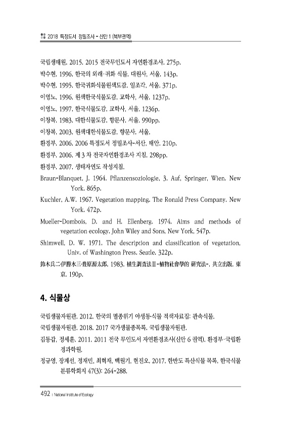 2018 특정도서 정밀조사 신안 1 북부권역 492 ? National Institute of Ecology 국립생태원. 2015. 2015 전국무인도서 자연환경조사. 275p. 박수현. 1996. 한국의 외래·귀화 식물. 대원사, 서울. 143p. 박수현. 1995. 한국귀화식물원색도감. 일조각, 서울. 371p. 이영노. 1996. 원색한국식물도감. 교학사, 서울. 1237p. 이영노. 1997. 한국식물도감. 교학사, 서울. 1236p. 이창복. 1983. 대한식물도감. 향문사. 서울. 990pp. 이창복. 2003. 원색대한식물도감. 향문사. 서울. 환경부. 2006. 2006 특정도서 정밀조사-서산, 태안. 210p. 환경부. 2006. 제 3 차 전국자연환경조사 지침. 298pp. 환경부. 200...