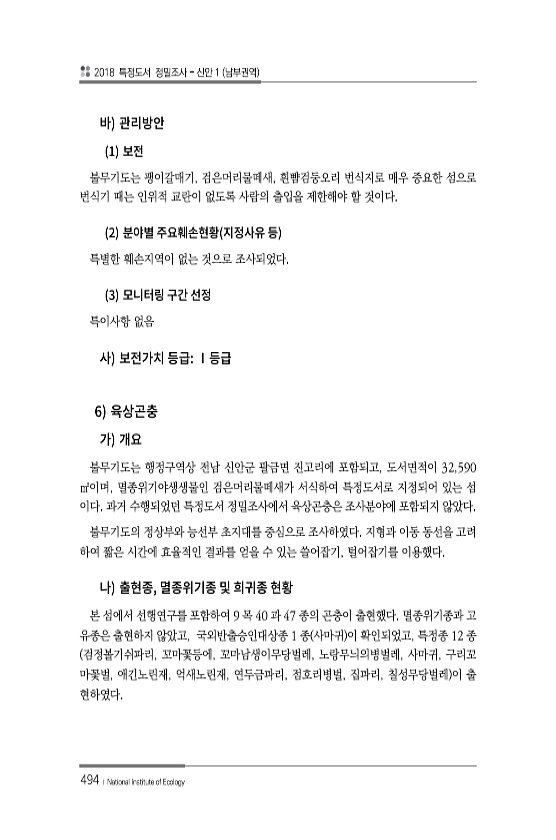 2018 특정도서 정밀조사 신안 1 남부권역 494 ? National Institute of Ecology 1 불무기도는 괭이갈매기, 검은머리물떼새, 흰뺨검둥오리 번식지로 매우 중요한 섬으로 번식기 때는 인위적 교란이 없도록 사람의 출입을 제한해야 할 것이다. 2 특별한 훼손지역이 없는 것으로 조사되었다. 3 특이사항 없음 6 불무기도는 행정구역상 전남 신안군 팔금면 진고리에 포함되고, 도서면적이 32,590 ㎡이며, 멸종위기야생생물인 검은머리물떼새가 서식하여 특정도서로 지정되어 있는 섬 이다. 과거 수행되었던 특정도서 정밀조사에서 육상곤충은 조사분야에 포함되지 않았다. 불무기도의 정상부와 능선부 초지대를 중심으로 조사하였다. 지형과 이동 동선을 고려 하여 짧은 시간에 효율적인 결과를 얻을 수 있는 쓸어잡...