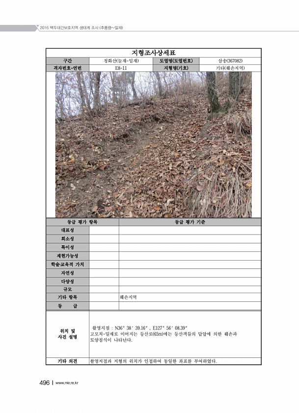 2016 백두대간보호지역 생태계 조사 추풍령밀재 496Ⅰwww.nie.re.kr 지형조사상세표 구간 청화산 늘재-밀재 도엽명 도엽번호 삼송 367082 격자번호-연번 E8-11 지형명 기호 기타 훼손지역 등급 평가 항목 등급 평가 기준 대표성 희소성 특이성 재현가능성 학술?교육적 가치 자연성 다양성 규모 기타 항목 훼손지역 등 급 위치 및 사진 설명 촬영지점 N36° 38′ 39.16″ , E127° 56′ 08.39″ 고모치-밀재로 이어지는 등산로 65m 에는 등산객들의 답압에 의한 훼손과 토양침식이 나타난다. 기타 의견 촬영지점과 지형의 위치가 인접하여 동일한 좌표를부여하였다.