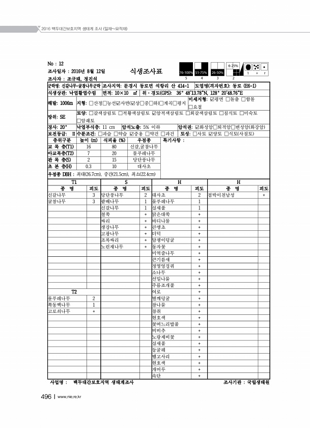 2016 백두대간보호지역 생태계 조사 밀재묘적재 496Ⅰwww.nie.re.kr No 12 조사일자 2016년 8월 12일 조사자 조규태, 정진석 식생조사표 군락명신갈나무-굴참나무군락 조사지역문경시 동로면 석항리 산 414-1 도엽명 격자번호 동로 E6-1 식생상관낙엽활엽수림 면적10×10 ㎡ 위·경도 GPS 36° 4813.78N, 128° 2048.76E 해발1006m 지형□산정□능선?사면 ?상□중□하 □계곡□평지 미세지형?평면 □돌출 □함몰 □요철 방위SE 토양□갈색삼림토 □적황색삼림토 ?암적색삼림토 □회갈색삼림토 □침식토 □미숙토 □암쇄토 경사20° 낙엽부식층11 cm 암석노출5% 이하 암석권?화성암□퇴적암□변성암 화강암 보전등급Ⅱ 수분조건□과습 □약습 ?중용 □약건 □과건 토성□사토 ?양토 □식토 ...