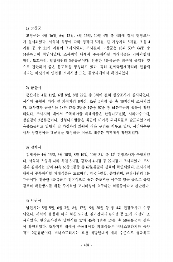 488 1 고창군 고창군은 4월 16일, 6월 13일, 8월 15일, 10월 4일 총 4회에 걸쳐 현장조사 가 실시되었다. 서식처 유형에 따라 경작지 5지점, 길 가장자리 5지점, 초원 4 지점 등 총 21개 지점이 조사되었다. 조사결과 고창군은 18과 50속 64종 총 64분류군이 확인되었다. 조사지역 내에서 주목해야할 외래식물은 긴까락빕새 귀리, 도꼬마리, 털참새귀리 3분류군이다. 전술한 3분류군은 최근에 유입된 것 으로 판단되며 좁은 분포역을 형성하고 있다. 특히 긴까락빕새귀리와 털참새 귀리는 바닷가와 인접한 모래사장 또는 흙방파제에서 확인되었다. 2 군산시 군산시는 4월 11일, 6월 8일, 8월 22일 총 3회에 걸쳐 현장조사가 실시되었다. 서식처 유형에 따라 길 가장자리 8지점, 초원 5지점 등 ...