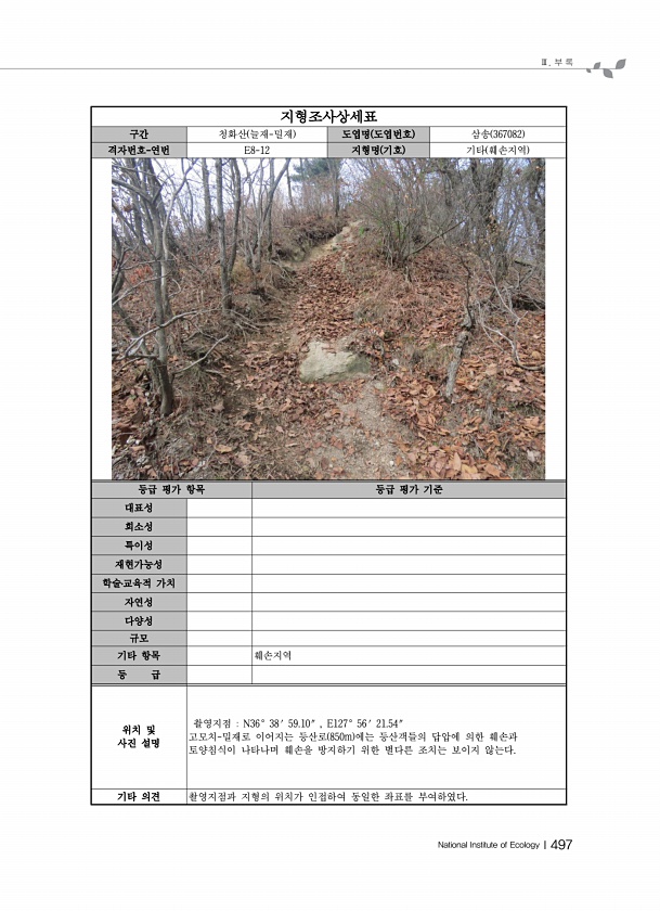 Ⅲ. 부 록 National Institute of EcologyⅠ497 지형조사상세표 구간 청화산 늘재-밀재 도엽명 도엽번호 삼송 367082 격자번호-연번 E8-12 지형명 기호 기타 훼손지역 등급 평가 항목 등급 평가 기준 대표성 희소성 특이성 재현가능성 학술?교육적 가치 자연성 다양성 규모 기타 항목 훼손지역 등 급 위치 및 사진 설명 촬영지점 N36° 38′ 59.10″ , E127° 56′ 21.54″ 고모치-밀재로 이어지는 등산로 850m 에는 등산객들의 답압에 의한 훼손과 토양침식이 나타나며 훼손을 방지하기 위한 별다른 조치는 보이지 않는다. 기타 의견 촬영지점과 지형의 위치가 인접하여 동일한 좌표를부여하였다.