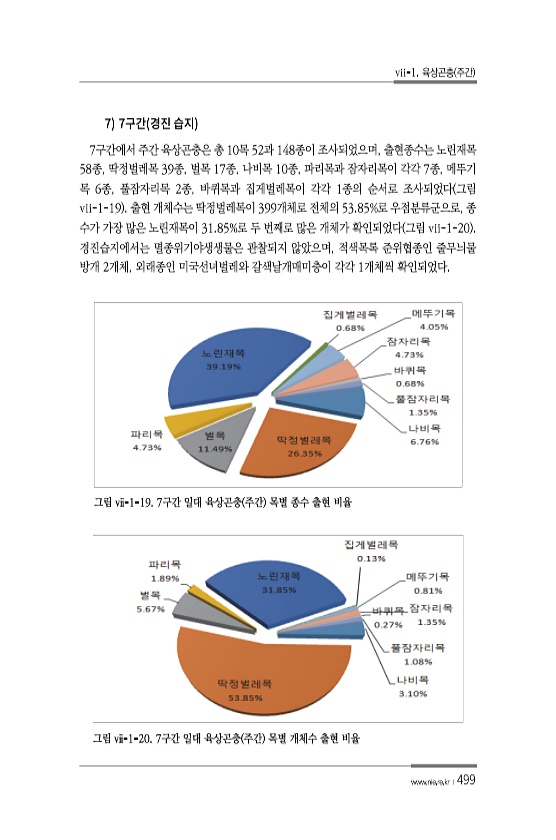 vii-1. 육상곤충 주간 www.nie.re.kr ?499 7 7 7구간에서 주간 육상곤충은 총 10목 52과 148종이 조사되었으며, 출현종수는 노린재목 58종, 딱정벌레목 39종, 벌목 17종, 나비목 10종, 파리목과 잠자리목이 각각 7종, 메뚜기 목 6종, 풀잠자리목 2종, 바퀴목과 집게벌레목이 각각 1종의 순서로 조사되었다 그림 vii-1-19 출현 개체수는 딱정벌레목이 399개체로 전체의 53.85%로 우점분류군으로, 종 수가 가장 많은 노린재목이 31.85%로 두 번째로 많은 개체가 확인되었다 그림 vii-1-20 경진습지에서는 멸종위기야생생물은 관찰되지 않았으며, 적색목록 준위협종인 줄무늬물 방개 2개체, 외래종인 미국선녀벌레와 갈색날개매미충이 각각 1개체씩 확인되었다. 그림 ⅶ-1-19. ...