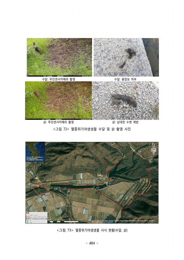 484 수달 무인센서카메라 촬영 수달 용양보 하부 삵 무인센서카메라 촬영 삵 남대천 수변 제방 그림 72 멸종위기야생생물 수달 및 삵 촬영 사진 그림 73 멸종위기야생생물 서식 현황 수달 삵 ,