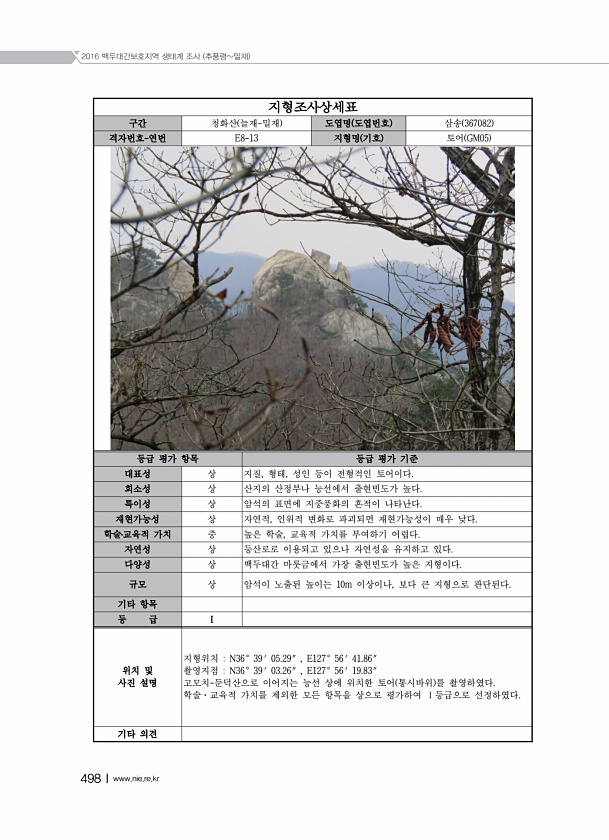 2016 백두대간보호지역 생태계 조사 추풍령밀재 498Ⅰwww.nie.re.kr 지형조사상세표 구간 청화산 늘재-밀재 도엽명 도엽번호 삼송 367082 격자번호-연번 E8-13 지형명 기호 토어 GM05 등급 평가 항목 등급 평가 기준 대표성 상 지질, 형태, 성인 등이 전형적인 토어이다. 희소성 상 산지의 산정부나 능선에서 출현빈도가 높다. 특이성 상 암석의 표면에 지중풍화의 흔적이 나타난다. 재현가능성 상 자연적, 인위적 변화로 파괴되면 재현가능성이 매우 낮다. 학술?교육적 가치 중 높은 학술, 교육적 가치를 부여하기 어렵다. 자연성 상 등산로로 이용되고 있으나 자연성을 유지하고 있다. 다양성 상 백두대간 마룻금에서 가장 출현빈도가 높은 지형이다. 규모 상 암석이 노출된 높이는 10m 이상이나, 보다 큰...