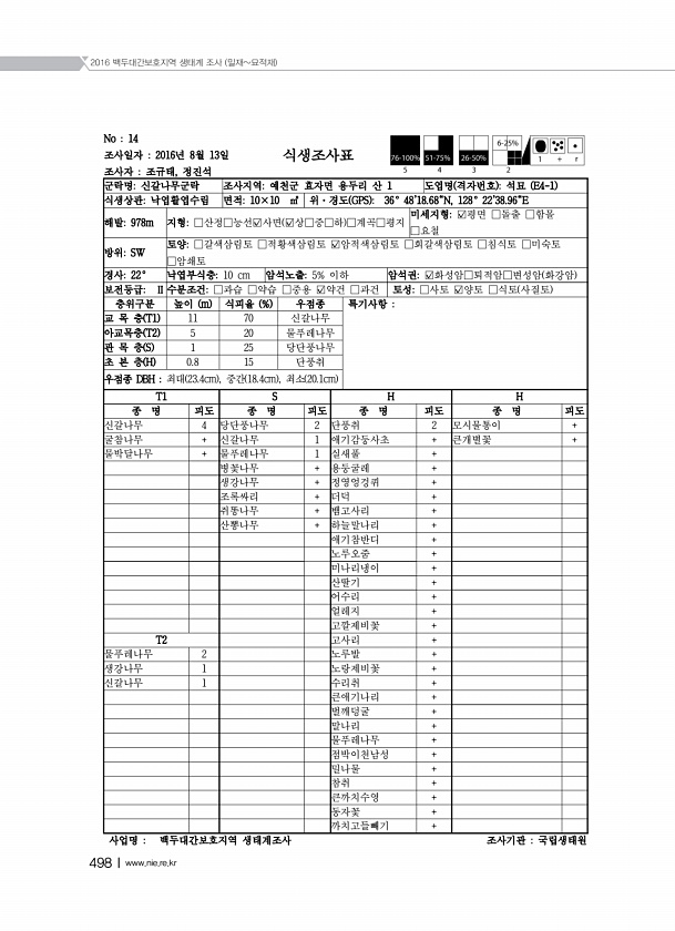 2016 백두대간보호지역 생태계 조사 밀재묘적재 498Ⅰwww.nie.re.kr No 14 조사일자 2016년 8월 13일 조사자 조규태, 정진석 식생조사표 군락명신갈나무군락 조사지역예천군 효자면 용두리 산 1 도엽명 격자번호 석묘 E4-1 식생상관낙엽활엽수림 면적10×10 ㎡ 위·경도 GPS 36° 4818.68N, 128° 2238.96E 해발978m 지형□산정□능선?사면 ?상□중□하 □계곡□평지 미세지형?평면 □돌출 □함몰 □요철 방위SW 토양□갈색삼림토 □적황색삼림토 ?암적색삼림토 □회갈색삼림토 □침식토 □미숙토 □암쇄토 경사22° 낙엽부식층10 cm 암석노출5% 이하 암석권?화성암□퇴적암□변성암 화강암 보전등급Ⅱ 수분조건□과습 □약습 □중용 ?약건 □과건 토성□사토 ?양토 □식토 사질토 층위구분 높...