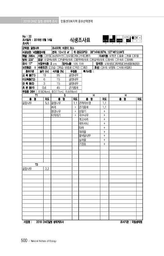 2018 DMZ 일원 생태계 조사 민통선이북지역 중부산악권역 500 ? National Institute of Ecology No 22 조사일자 2018년 5월 14일 조사자 식생조사표 군락명굴참나무 조사지역비운이 코스 식생상관낙엽활엽수림 면적10×10 ㎡ 위·경도 GPS 38°1448.50N, 127°4612.04E 해발295m 지형□산정□능선?사면 □상?중□하 □계곡□평지 미세지형?평면 □돌출 □함몰 □요철 방위229° 토양?갈색삼림토 □적황색삼림토 □암적색삼림토 □회갈색삼림토 □침식토 □미숙토 □암쇄토 경사17° 낙엽부식층2 cm 암석노출10% 이하 암석권?화성암□퇴적암□변성암 화강암 보전등급Ⅱ 수분조건□과습 □약습 ?중용 □약건 □과건 토성□사토 ?양토 □식토 사질토 층위구분 높이 m 식피율 % 우점...