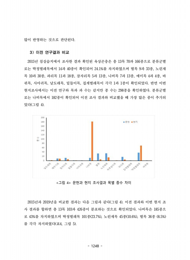 1248 많이 반영하는 것으로 판단된다. 3 이전 연구결과 비교 2015년 침실습지에서 조사한 결과 확인된 육상곤충은 총 13목 70과 166종으로 분류군별 로는 딱정벌레목에서 14과 40종이 확인되어 24.1%를 차지하였으며 벌목 9과 33종, 노린재 목 10과 30종, 파리목 11과 18종, 잠자리목 5과 13종, 나비목 7과 13종, 매미목 4과 4종, 바 퀴목, 사마귀목, 날도래목, 밑들이목, 집게벌레목이 각각 1과 1종이 확인되었다. 반면 이번 현지조사에서는 이전 연구와 목과 과 수는 같지만 종 수는 298종을 확인하였다. 분류군별 로는 나비목에서 182종이 확인되어 이전 조사 결과와 비교했을 때 가장 많은 종이 추가되 었다 그림 4 그림 4 문헌과 현지 조사결과 목별 종수 차이 2015년과 201...