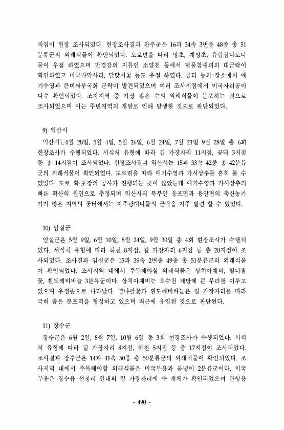 490 지점이 현장 조사되었다. 현장조사결과 완주군은 16과 34속 3변종 48종 총 51 분류군의 외래식물이 확인되었다. 도로변을 따라 망초, 개망초, 유럽점나도나 물이 우점 하였으며 만경강의 지류인 소양천 등에서 털물참새피의 대군락이 확인하였고 미국가막사리, 달맞이꽃 등도 우점 하였다. 공터 등의 장소에서 애 기수영과 큰비짜루국화 군락이 발견되었으며 여러 조사지점에서 미국자리공이 다수 확인되었다. 조자지역 중 가장 많은 수의 외래식물이 분포하는 것으로 조사되었으며 이는 주변지역의 개발로 인해 발생한 것으로 판단되었다. 9 익산시 익산시는4월 28일, 5월 4일, 5월 26일, 6월 24일, 7월 21일 9월 28일 총 6회 현장조사가 수행되었다. 서식처 유형에 따라 길 가장자리 11지점, 공터 3지점 등...