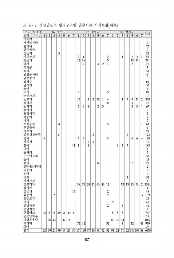 표 Ⅵ- 8. 경상남도의 행정구역별 담수어류 서식현황 계속 지역명 종명 16. 함안시 17. 함양군 18. 합천군 합계 1 2 3 4 5 6 7 1 2 3 4 5 6 7 1 2 3 4 5 6 7 가물치 3 가시납지리 4 갈겨니 72 갈문망둑 9 강준치 5 24 기름종개 2 1 2 1 2 2 4 51 긴몰개 12 16 5 13 13 241 꺽지 2 4 2 1 2 77 꾹저구 5 끄리 51 남방동사리 1 남방종개 3 납자루 61 납지리 33 농어 1 누치 8 5 89 눈동자개 9 돌고기 13 4 2 15 1 4 1 3 8 21 2 298 돌마자 8 3 1 77 동사리 2 4 1 2 3 2 3 1 67 동자개 2 드렁허리 1 떡붕어 7 메기 7 모래무지 4 5 1 63 문절망둑 1 미꾸리 28 민물검정망둑 11 ...