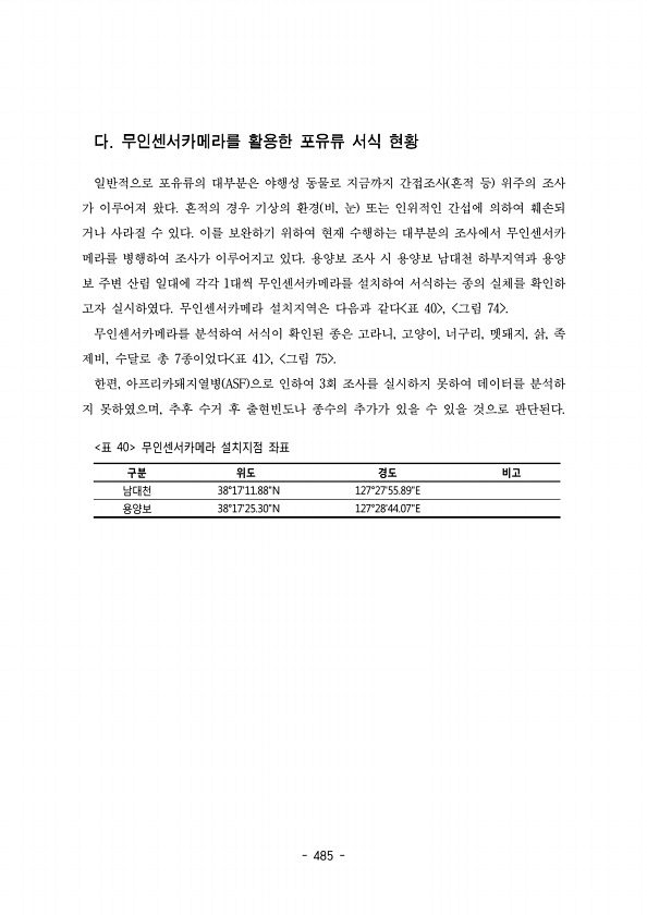 485 일반적으로 포유류의 대부분은 야행성 동물로 지금까지 간접조사 흔적 등 위주의 조사 가 이루어져 왔다 흔적의 경우 기상의 환경 비 눈 또는 인위적인 간섭에 의하여 훼손되 , 거나 사라질 수 있다 이를 보완하기 위하여 현재 수행하는 대부분의 조사에서 무인센서카 메라를 병행하여 조사가 이루어지고 있다 용양보 조사 시 용양보 남대천 하부지역과 용양 보 주변 산림 일대에 각각 대씩 무인센서카메라를 설치하여 서식하는 종의 실체를 확인하 1 고자 실시하였다. 무인센서카메라 설치지역은 다음과 같다 표 그림 40 , 74 무인센서카메라를 분석하여 서식이 확인된 종은 고라니 고양이 너구리 멧돼지 삵 족 , , , , , 제비 수달로 총 종이었다 표 그림 , 7 41 , 75 한편 아프리카돼지열병 으로 인하여 회 조사를...