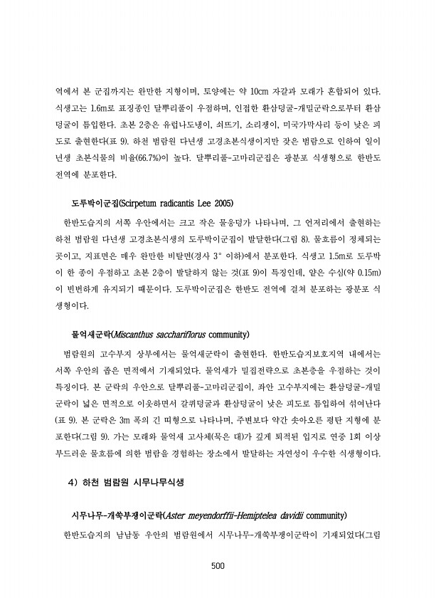 500 역에서 본 군집까지는 완만한 지형이며, 토양에는 약 10cm 자갈과 모래가 혼합되어 있다. 식생고는 1.6m로 표징종인 달뿌리풀이 우점하며, 인접한 환삼덩굴-개밀군락으로부터 환삼 덩굴이 틈입한다. 초본 2층은 유럽나도냉이, 쇠뜨기, 소리쟁이, 미국가막사리 등이 낮은 피 도로 출현한다 표 9 하천 범람원 다년생 고경초본식생이지만 잦은 범람으로 인하여 일이 년생 초본식물의 비율 66.7% 이 높다. 달뿌리풀-고마리군집은 광분포 식생형으로 한반도 전역에 분포한다. 도루박이군집 Scirpetum radicantis Lee 2005 한반도습지의 서쪽 우안에서는 크고 작은 물웅덩가 나타나며, 그 언저리에서 출현하는 하천 범람원 다년생 고경초본식생의 도루박이군집이 발달한다 그림 8 물흐름이 정체되는 곳이고, 지표...