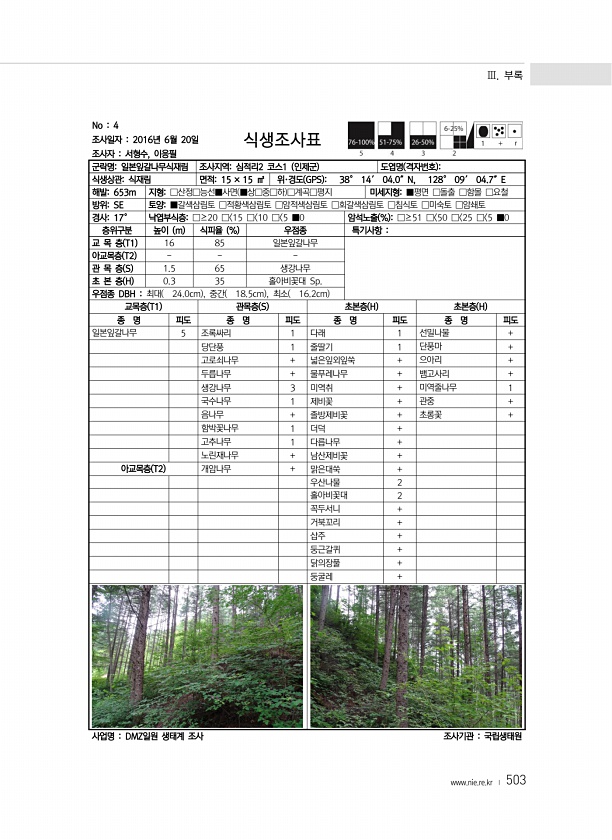 Ⅲ. 부록 www.nie.re.kr ? 503 No 4 조사일자 2016년 6월 20일 조사자 서형수, 이응필 식생조사표 군락명일본잎갈나무식재림 조사지역심적리2 코스1 인제군 도엽명 격자번호 식생상관식재림 면적15 × 15 ㎡ 위·경도 GPS 38° 14′ 04.0″N, 128° 09′ 04.7″E 해발653m 지형□산정□능선■사면 ■상□중□하 □계곡□평지 미세지형■평면 □돌출 □함몰 □요철 방위SE 토양■갈색삼림토 □적황색삼림토 □암적색삼림토 □회갈색삼림토 □침식토 □미숙토 □암쇄토 경사17° 낙엽부식층□≥20 □ 15 □ 10 □ 5 ■0 암석노출 % □≥51 □ 50 □ 25 □ 5 ■0 층위구분 높이 m 식피율 % 우점종 특기사항 교 목 층 T1 16 85 일본잎갈나무 아교목층 T2 관 목 층 S 1...