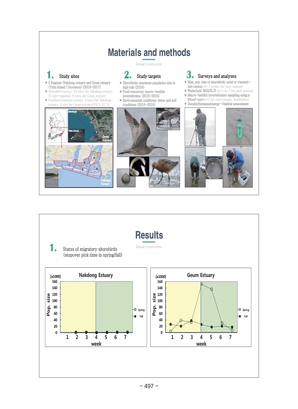 Results Status of migratory shorebirds stopover pick time in spring/fall 1. Estuary ecosystem Nakdong Estuary Geum Estuary Spring Fall Spring Fall Pop. size Pop. size 1 2 3 4 5 6 7 week 1 2 3 4 5 6 7 week Materials and methods Study sites ? 2 RegionsNakdong estuary and Geum estuary Yubu Island Seocheon 20162017 ? Shorebird survey13 sites for Nakdong estuary 5 sub-regions , 8 sites for Geum estuary...