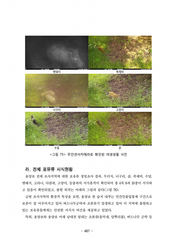 487 멧돼지 족제비 너구리 고양이 수달 삵 그림 75 무인센서카메라로 확인된 야생생물 사진 용양보 전체 조사지역에 대한 포유류 정밀조사 결과 두더지 너구리 삵 족제비 수달 , , , , , , 멧돼지 고라니 다람쥐 고양이 등줄쥐의 서식흔적이 확인되어 총 목 과 종이 서식하 , , , , 4 8 10 고 있음이 확인되었고 출현 위치는 아래의 그림과 같다 그림 , 76 금번 조사지역의 환경적 특성을 보면 용양보 본 습지 내부는 민간인출입통제 구간으로 , 보존이 잘 이루어지고 있어 버드나무군락과 초본류가 밀생하고 있어 이 지역에 출현하고 있는 포유류들에게는 안전한 서식지 여건을 제공하고 있었다. 특히 용양보와 용양보 아래 남대천 일대는 초본류 물억새 달뿌리풀 버드나무 군락 등 , ,,