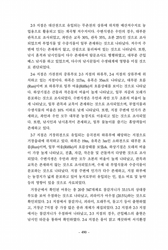 2-5 지점은 대산천으로 유입되는 무촌천의 상류에 위치한 매산저수지로 농 업용으로 활용되고 있는 계곡형 저수지이다. 수변식생은 우안의 경우, 대부분 관목으로 조사되었고, 좌안은 교목 30%, 관목 35%, 초본 25%인 것으로 조사 되었으며 부엽식물 및 수중식물이 일부 존재하는 것으로 나타났다. 저수지 주 변에 인가는 존재하지 않고, 산림으로 둘러싸여 있는 것으로 나타났다. 또한, 낚시 흔적과 낚시인들이 다수 존재하여 탐문조사도 병행하였고, 대부분 큰입 배스 낚시를 하고 있었으며, 다수의 낚시꾼들이 수생태계에 영향을 미칠 것으 로 판단되었다. 2-6 지점은 가천천의 중류부로 2-3 지점의 하류부, 2-4 지점의 상류부에 위 치하고 있는 지점이다. 하폭은 117m, 유폭은 35m로 나타났고, 대부분 흐름 Ru...