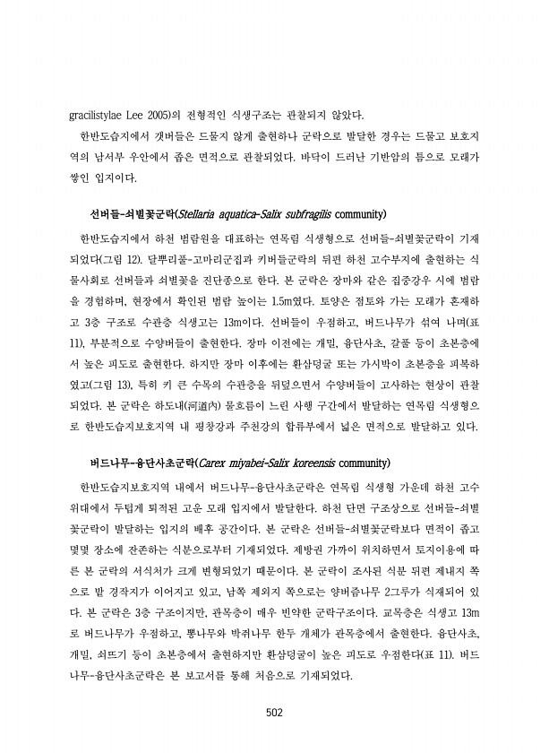 502 gracilistylae Lee 2005 의 전형적인 식생구조는 관찰되지 않았다. 한반도습지에서 갯버들은 드물지 않게 출현하나 군락으로 발달한 경우는 드물고 보호지 역의 남서부 우안에서 좁은 면적으로 관찰되었다. 바닥이 드러난 기반암의 틈으로 모래가 쌓인 입지이다. 선버들-쇠별꽃군락 Stellaria aquatica-Salix subfragilis community 한반도습지에서 하천 범람원을 대표하는 연목림 식생형으로 선버들-쇠별꽃군락이 기재 되었다 그림 12 달뿌리풀-고마리군집과 키버들군락의 뒤편 하천 고수부지에 출현하는 식 물사회로 선버들과 쇠별꽃을 진단종으로 한다. 본 군락은 장마와 같은 집중강우 시에 범람 을 경험하며, 현장에서 확인된 범람 높이는 1.5m였다. 토양은 점토와 가는 모래가 혼...