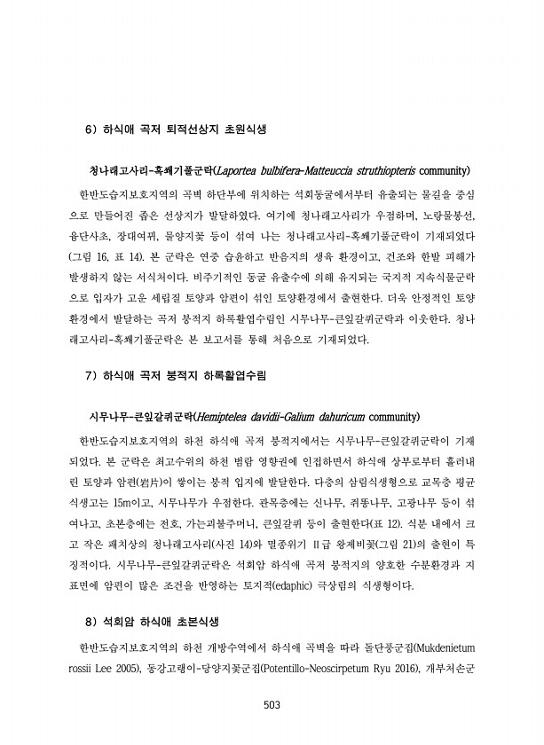 503 6 하식애 곡저 퇴적선상지 초원식생 청나래고사리-혹쐐기풀군락 Laportea bulbifera-Matteuccia struthiopteris community 한반도습지보호지역의 곡벽 하단부에 위치하는 석회동굴에서부터 유출되는 물길을 중심 으로 만들어진 좁은 선상지가 발달하였다. 여기에 청나래고사리가 우점하며, 노랑물봉선, 융단사초, 장대여뀌, 물양지꽃 등이 섞여 나는 청나래고사리-혹쐐기풀군락이 기재되었다 그림 16, 표 14 본 군락은 연중 습윤하고 반음지의 생육 환경이고, 건조와 한발 피해가 발생하지 않는 서식처이다. 비주기적인 동굴 유출수에 의해 유지되는 국지적 지속식물군락 으로 입자가 고운 세립질 토양과 암편이 섞인 토양환경에서 출현한다. 더욱 안정적인 토양 환경에서 발달하는 곡저 붕적지 하록...