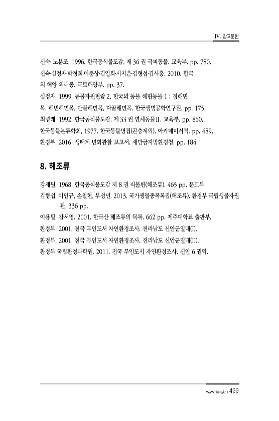IV. 참고문헌 www.nie.re.kr ?499 신숙? 노분조, 1996. 한국동식물도감, 제 36 권 극피동물. 교육부. pp. 780. 신숙?심정자?박정희?이준상?김일회?서지은?김형섭?김사흥, 2010. 한국 의 해양 외래종. 국토해양부. pp. 37. 심정자, 1999. 동물자원편람 2, 한국의 동물 해면동물 1 경해면 목, 해변해면목, 단골해면목, 다골해면목. 한국생명공학연구원. pp. 175. 최병래, 1992. 한국동식물도감, 제 33 권 연체동물Ⅱ. 교육부. pp. 860. 한국동물분류학회, 1977. 한국동물명집 곤충제외 아카데미서적. pp. 489. 환경부, 2016. 생태계 변화관찰 보고서. 새만금지방환경청. pp. 184 8. 강제원. 1968. 한국동식물도감 제 8 권 식물편 해조류 ...