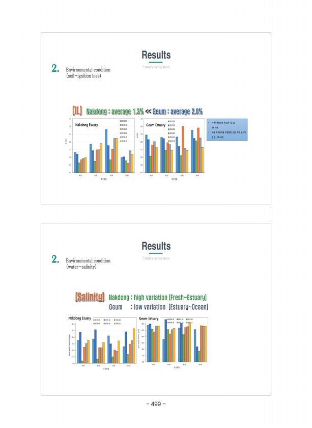 Environmental condition water-salinity 2. Results Estuary ecosystem Nakdong Esuary Geum Estuary Environmental condition soil-ignition loss 2. Results Estuary ecosystem ? 미국지역환경청 비오염 기준 값 5% 이하 ? 국내 해저퇴적물 부영양화 관련 최저 농도기 준 값 5% 미만 Nakdong Esuary Geum Estuary 499