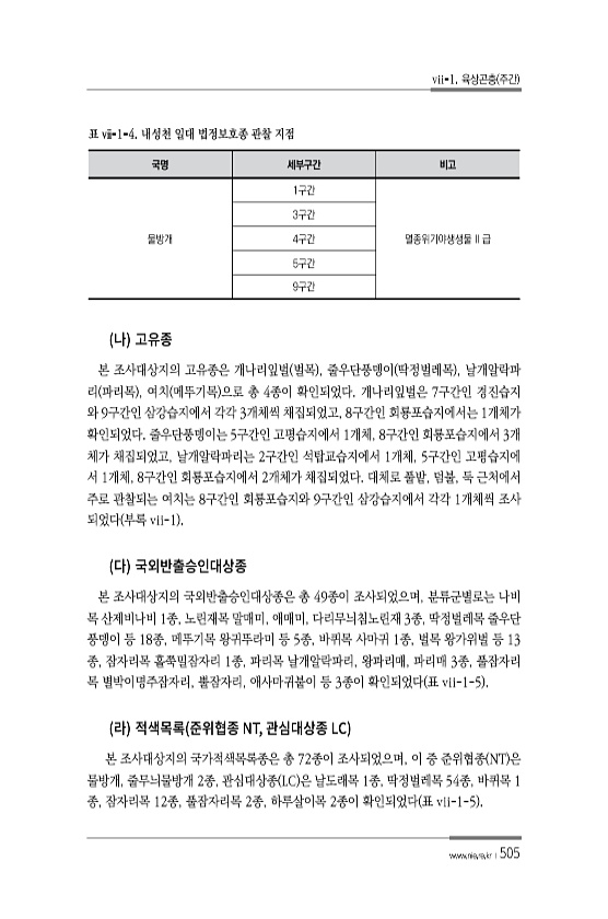 vii-1. 육상곤충 주간 www.nie.re.kr ?505 국명 세부구간 비고 물방개 1구간 멸종위기야생생물 II 급 3구간 4구간 5구간 9구간 표 ⅶ-1-4. 내성천 일대 법정보호종 관찰 지점 본 조사대상지의 고유종은 개나리잎벌 벌목 , 줄우단풍뎅이 딱정벌레목 , 날개알락파 리 파리목 , 여치 메뚜기목 으로 총 4종이 확인되었다. 개나리잎벌은 7구간인 경진습지 와 9구간인 삼강습지에서 각각 3개체씩 채집되었고, 8구간인 회룡포습지에서는 1개체가 확인되었다. 줄우단풍뎅이는 5구간인 고평습지에서 1개체, 8구간인 회룡포습지에서 3개 체가 채집되었고, 날개알락파리는 2구간인 석탑교습지에서 1개체, 5구간인 고평습지에 서 1개체, 8구간인 회룡포습지에서 2개체가 채집되었다. 대체로 풀밭, 덤불, 둑 근처에서 ...