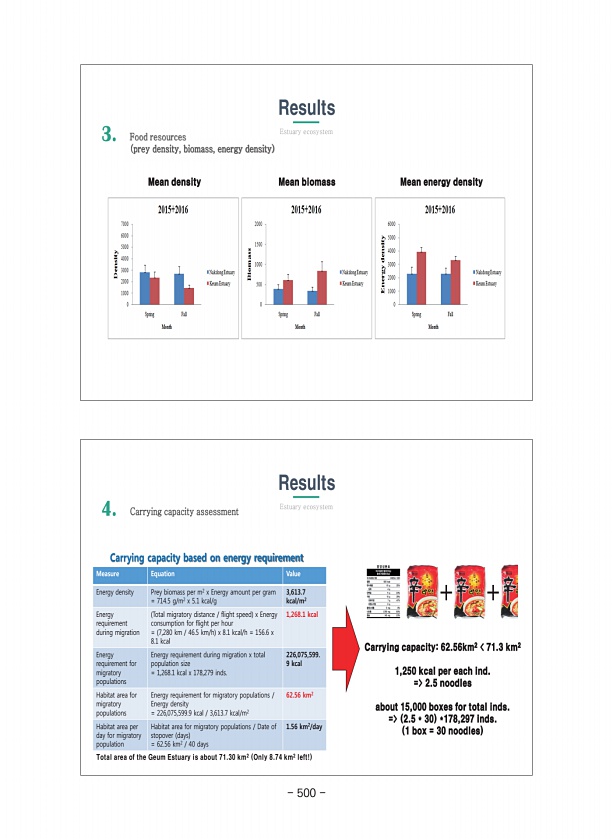 4. Carrying capacity assessment + + Carrying capacity based on energy requirement Carrying capacity62.56km2 71.3 km2 1,250 kcal per each ind. = 2.5 noodles about 15,000 boxes for total inds. = 2.5 * 30 *178,297 inds. 1 box = 30 noodles Results Estuary ecosystem Measure Equation Value Energy density Prey biomass per m2 x Energy amount per gram = 714.5 g/m2 x 5.1 kcal/g 3,613.7 kcal/m2 Energy requir...