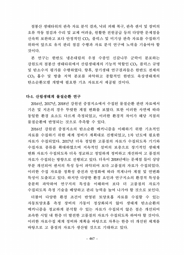467 점봉산 생태타워의 관측 자료 분석 결과, 낙뢰 피해 복구, 관측 센서 및 장비의 오류 작동 점검과 수리 및 교체 어려움, 원활한 전원공급 등의 다양한 문제점을 신속히 보완하고 보다 안정적인 CO₂ 플럭스 및 미기상 관측 자료를 수집하기 위하여 앞으로 유지 관리 점검 수행과 자료 분석 연구에 노력을 기울여야 할 것이다. 본 연구는 한반도 냉온대림의 우점 수종인 신갈나무 군락이 분포하는 강원도의 점봉산 생태타워에서 산림생태계의 기능적 역할인 CO₂ 플럭스 규명 및 탄소수지 평가를 수행하였다. 향후, 장기생태 연구결과들은 한반도 전체의 CO₂ 흡수 및 방출 지역 분포를 파악하고 종합적인 한반도 육상생태계의 탄소순환모델 개발에 필요한 기초 자료로서 제공될 것이다. 다-1. 산림생태계 물질순환 연구 2016년...