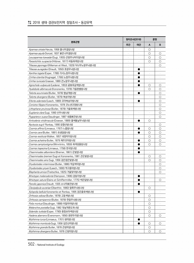 2018 생태·경관보전지역 정밀조사 동강유역 502 ? National Institute of Ecology 분류군명 현지조사 2018 문헌 주간 야간 A B Apamea striata Haruta, 1958 줄나무결밤나방 ○ Apamea aquila Donzel, 1837 붉은나무결밤나방 ○ ○ Leucapamea kawadai Sugi, 1955 큰흰무늬박이밤나방 ○ ○ Parastichtis suspecta H?bner, 1817 버들회색밤나방 ○ ○ Tiliacea japonago Wileman et West, 1929 닥나무노랑무늬밤나방 ○ Tiliacea auragides Draudt, 1950 호랑무늬밤나방 ● Xanthia togata Es...
