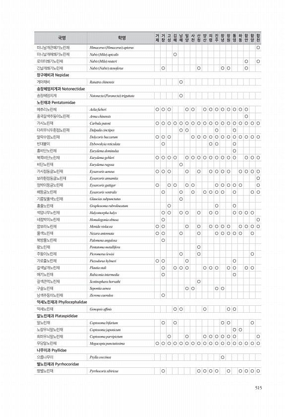 515 미니날개큰쐐기노린재 Himacerus Himacerus apterus ○ 미니날개애쐐기노린재 Nabis Milu apicalis ○ 로이터쐐기노린재 Nabis Milu reuteri ○ ○ 긴날개쐐기노린재 Nabis Nabis stenoferus ○ ○ ○ ○ ○ 장구애비과 Nepidae 게아재비 Ranatra chinensis ○ 송장헤엄치게과 Notonectidae 송장헤엄치게 Notonecta Paranecta triguttata ○ 노린재과 Pentatomidae 메추리노린재 Aelia feberi ○ ○ ○ ○ ○ ○ ○ ○ ○ ○ ○ ○ ○ 중국갈색주둥이노린재 Arma chinensis ○ 가시노린재 Carbula putoni ○ ○ ○ ○ ○ ○ ○ ○ ○ ○ ○ ○ ○ ○ ○ ○ ○ ○...