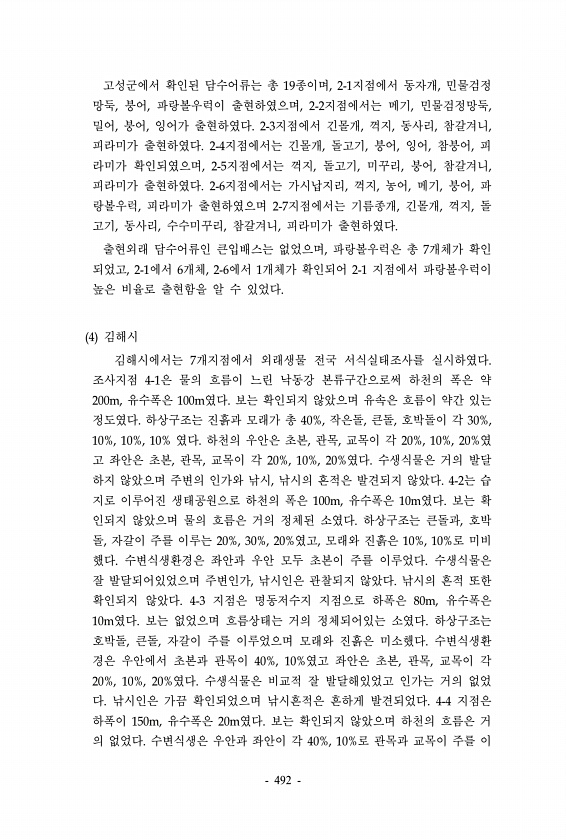 고성군에서 확인된 담수어류는 총 19종이며, 2-1지점에서 동자개, 민물검정 망둑, 붕어, 파랑볼우럭이 출현하였으며, 2-2지점에서는 메기, 민물검정망둑, 밀어, 붕어, 잉어가 출현하였다. 2-3지점에서 긴몰개, 꺽지, 동사리, 참갈겨니, 피라미가 출현하였다. 2-4지점에서는 긴몰개, 돌고기, 붕어, 잉어, 참붕어, 피 라미가 확인되였으며, 2-5지점에서는 꺽지, 돌고기, 미꾸리, 붕어, 참갈겨니, 피라미가 출현하였다. 2-6지점에서는 가시납지리, 꺽지, 농어, 메기, 붕어, 파 랑볼우럭, 피라미가 출현하였으며 2-7지점에서는 기름종개, 긴몰개, 꺽지, 돌 고기, 동사리, 수수미꾸리, 참갈겨니, 피라미가 출현하였다. 출현외래 담수어류인 큰입배스는 없었으며, 파랑볼우럭은 총 7개체가 확인 되었고, 2-1에서 ...