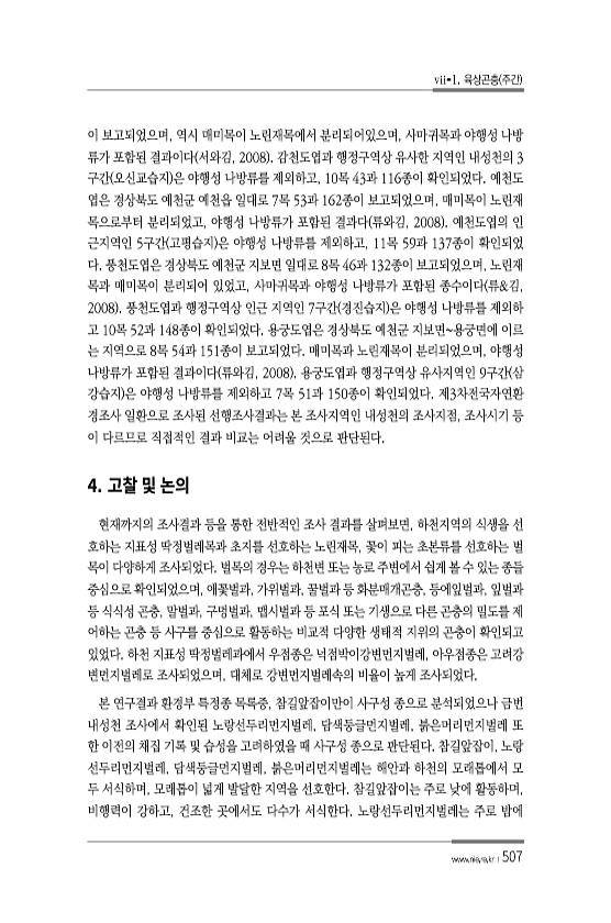 vii-1. 육상곤충 주간 www.nie.re.kr ?507 이 보고되었으며, 역시 매미목이 노린재목에서 분리되어있으며, 사마귀목과 야행성 나방 류가 포함된 결과이다 서와김, 2008 감천도엽과 행정구역상 유사한 지역인 내성천의 3 구간 오신교습지 은 야행성 나방류를 제외하고, 10목 43과 116종이 확인되었다. 예천도 엽은 경상북도 예천군 예천읍 일대로 7목 53과 162종이 보고되었으며, 매미목이 노린재 목으로부터 분리되었고, 야행성 나방류가 포함된 결과다 류와김, 2008 예천도엽의 인 근지역인 5구간 고평습지 은 야행성 나방류를 제외하고, 11목 59과 137종이 확인되었 다. 풍천도엽은 경상북도 예천군 지보면 일대로 8목 46과 132종이 보고되었으며, 노린재 목과 매미목이 분리되어 있었고, 사마...