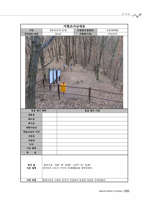 Ⅲ. 부 록 National Institute of EcologyⅠ505 지형조사상세표 구간 청화산 늘재-밀재 도엽명 도엽번호 삼송 367082 격자번호-연번 E8-20 지형명 기호 기타 안부 등급 평가 항목 등급 평가 기준 대표성 희소성 특이성 재현가능성 학술?교육적 가치 자연성 다양성 규모 기타 항목 등 급 위치 및 사진 설명 촬영지점 N36° 39′ 39.98″ , E127° 55′ 53.90″ 대야산과 고모치 사이의 밀재 660m 를 촬영하였다. 기타 의견 촬영지점과 지형의 위치가 인접하여 동일한 좌표를부여하였다.
