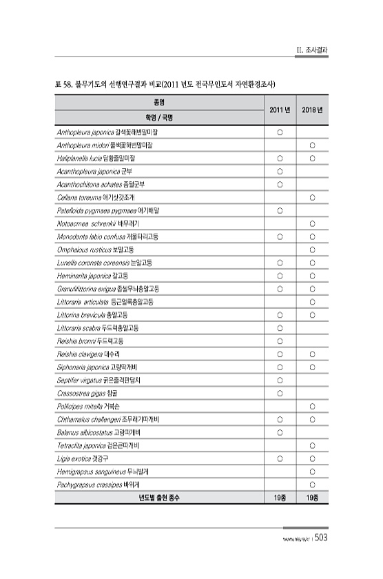 II. 조사결과 www.nie.re.kr ?503 종명 2011 년 2018 년 학명 국명 Anthopleura japonica 갈색꽃해변말미잘 ○ Anthopleura midori 풀색꽃해변말미잘 ○ Haliplanella lucia 담황줄말미잘 ○ ○ Acanthopleura japonica 군부 ○ Acanthochitona achates 좀털군부 ○ Cellana toreuma 애기삿갓조개 ○ Patelloida pygmaea pygmaea 애기배말 ○ Notoacmea schrenkii 배무래기 ○ Monodonta labio confusa 개울타리고둥 ○ ○ Omphaious rusticus 보말고둥 ○ Lunella coronata coreensis 눈알고둥 ○ ○ Heminerita japon...