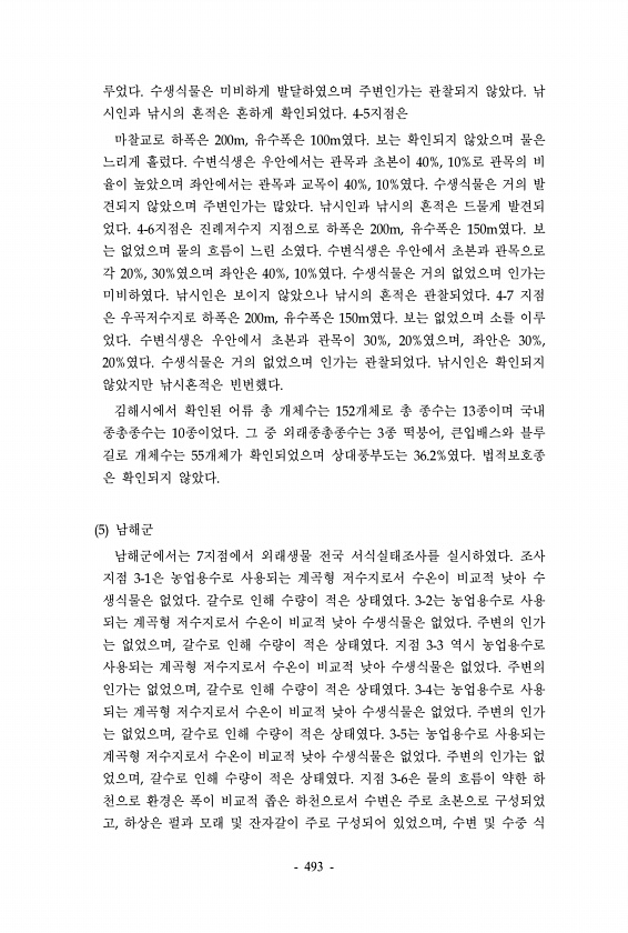 루었다. 수생식물은 미비하게 발달하였으며 주변인가는 관찰되지 않았다. 낚 시인과 낚시의 흔적은 흔하게 확인되었다. 4-5지점은 마찰교로 하폭은 200m, 유수폭은 100m였다. 보는 확인되지 않았으며 물은 느리게 흘렀다. 수변식생은 우안에서는 관목과 초본이 40%, 10%로 관목의 비 율이 높았으며 좌안에서는 관목과 교목이 40%, 10%였다. 수생식물은 거의 발 견되지 않았으며 주변인가는 많았다. 낚시인과 낚시의 흔적은 드물게 발견되 었다. 4-6지점은 진례저수지 지점으로 하폭은 200m, 유수폭은 150m였다. 보 는 없었으며 물의 흐름이 느린 소였다. 수변식생은 우안에서 초본과 관목으로 각 20%, 30%였으며 좌안은 40%, 10%였다. 수생식물은 거의 없었으며 인가는 미비하였다. 낚시인은 보이지 않...