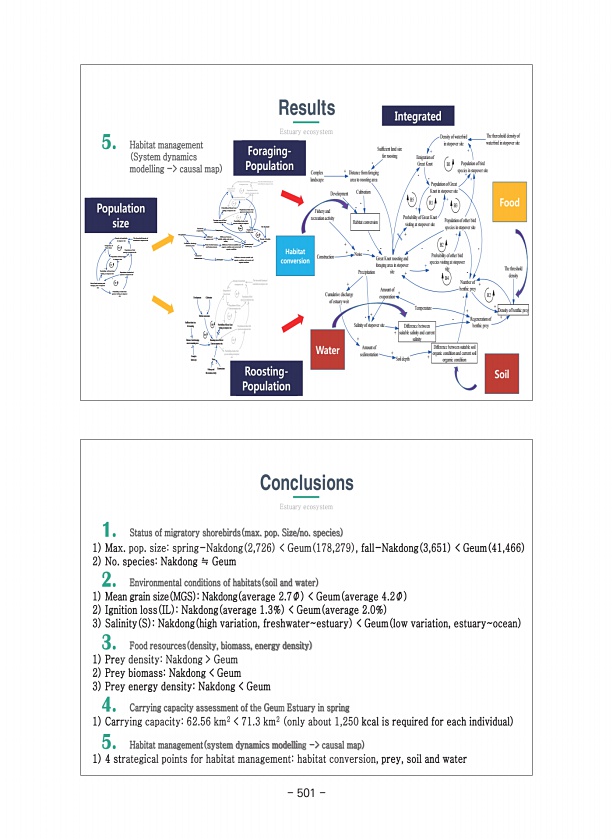 2. Environmental conditions of habitats soil and water 1 Mean grain size MGS Nakdong average 2.7Φ Geum average 4.2Φ 2 Ignition loss IL Nakdong average 1.3% Geum average 2.0% 3 Salinity S Nakdong high variation, freshwaterestuary Geum low variation, estuaryocean 1 Max. pop. sizespring-Nakdong 2,726 Geum 178,279 , fall-Nakdong 3,651 Geum 41,466 2 No. speciesNakdong ≒ Geum 1. Status of migratory shor...