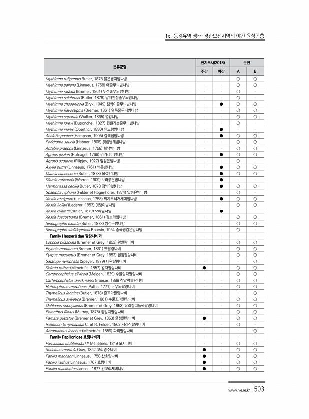 ix. 동강유역 생태·경관보전지역의 야간 육상곤충 www.nie.re.kr ?503 분류군명 현지조사 2018 문헌 주간 야간 A B Mythimna rufipennis Butler, 1878 붉은쌍띠밤나방 ○ ○ Mythimna pallens Linnaeus, 1758 애줄무늬밤나방 ○ ○ Mythimna radiata Bremer, 1861 두점줄무늬밤나방 ○ Mythimna salebrosa Butler, 1878 날개흰점줄무늬밤나방 ○ Mythimna chosenicola Bryk, 1949 점박이줄무늬밤나방 ● ○ ○ Mythimna flavostigma Bremer, 1861 얼룩줄무늬밤나방 ○ ○ Mythimna separata Walker, 186...